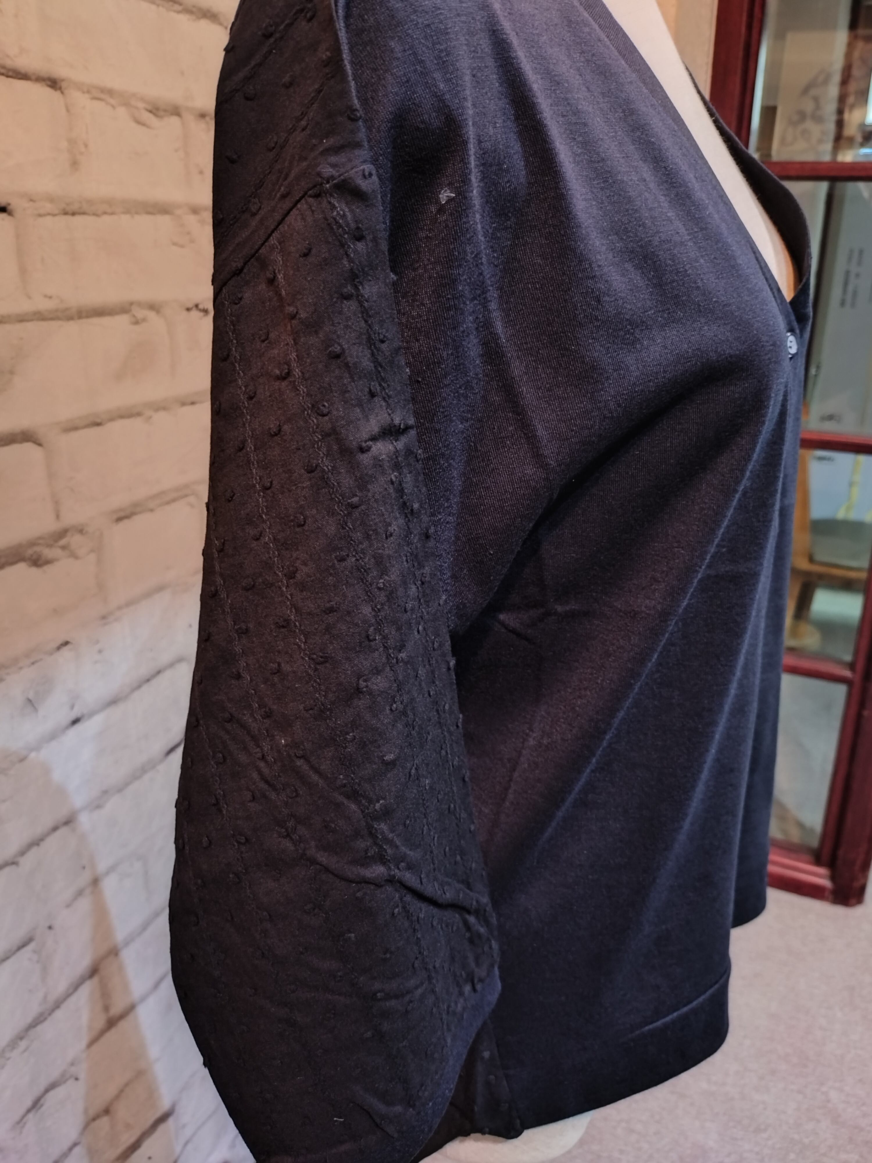 心地よいカットソー生地を使用したKeitto布帛切替カットカーディガンです。前身ごろにカットソー生地を取り入れたデザインが特徴で、ゆったりめのさらっとした着心地です。お米の粒をイメージしたカットドビー生地を袖と後ろ身頃に使っています。季節の変わり目にぴったりのアイテムで、定番のボトムスとの組み合わせで、豊富なコーディネートを楽しんでいただけます!色は海苔をイメージしたダークネイビーです。