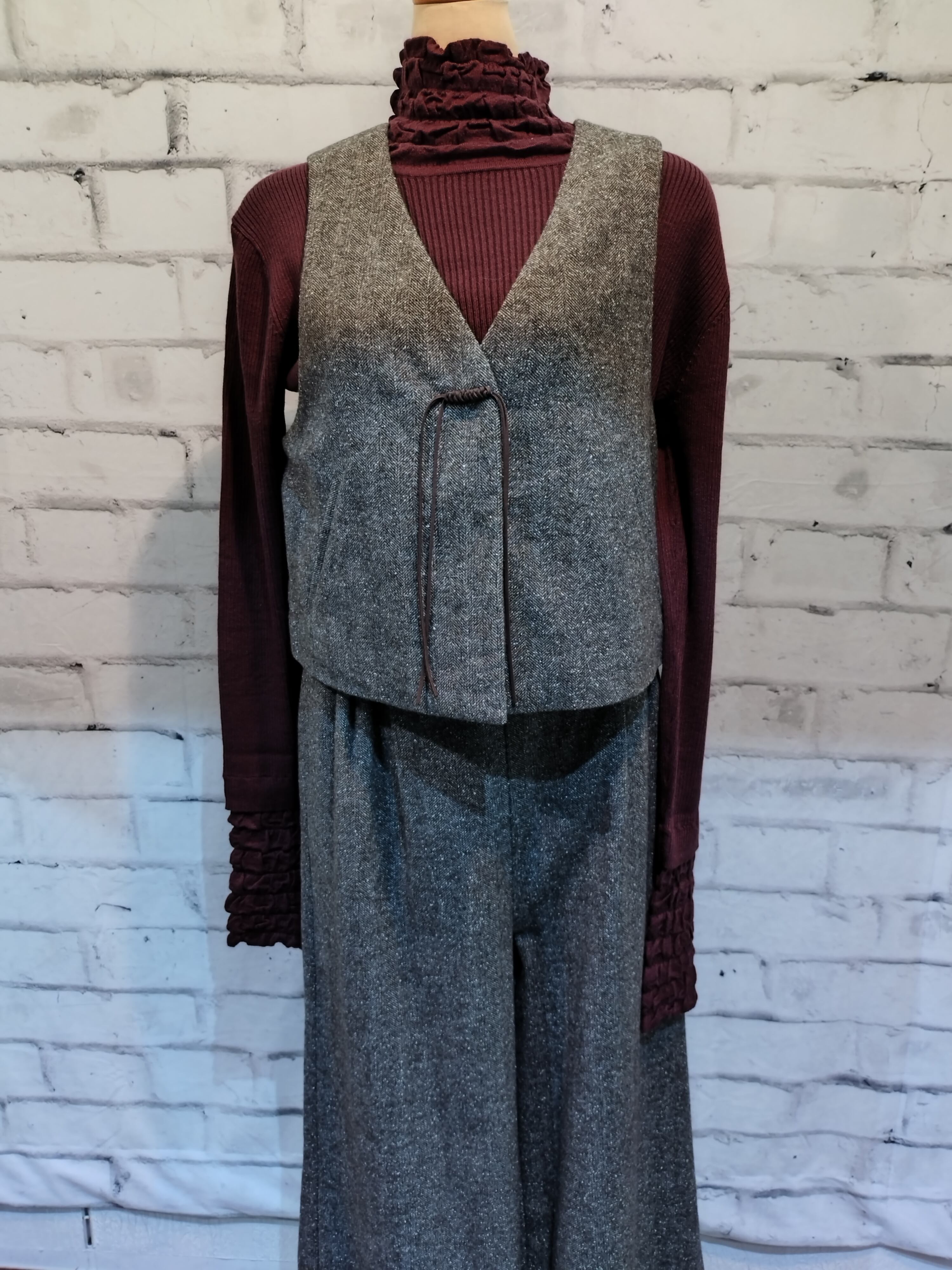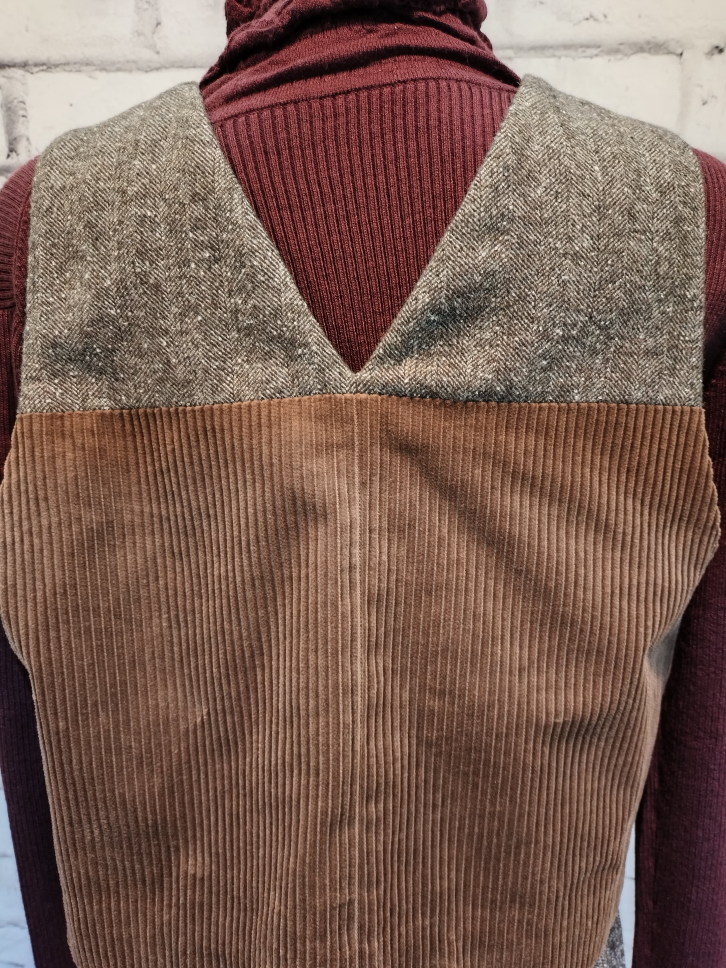 このベストは、へリンボンと太コーデュロイの異素材を組み合わせたおしゃれなクロッブド丈が特徴です。